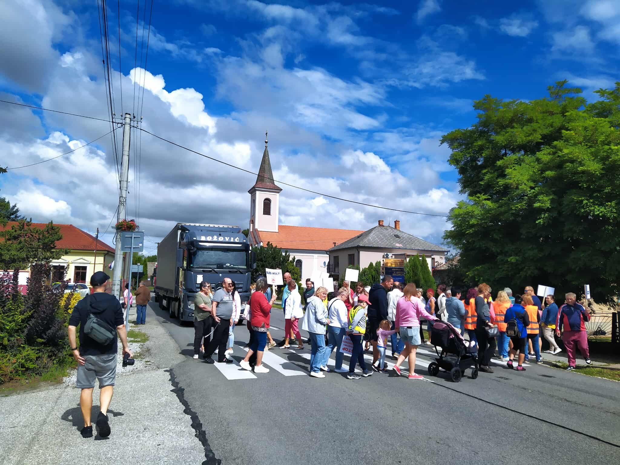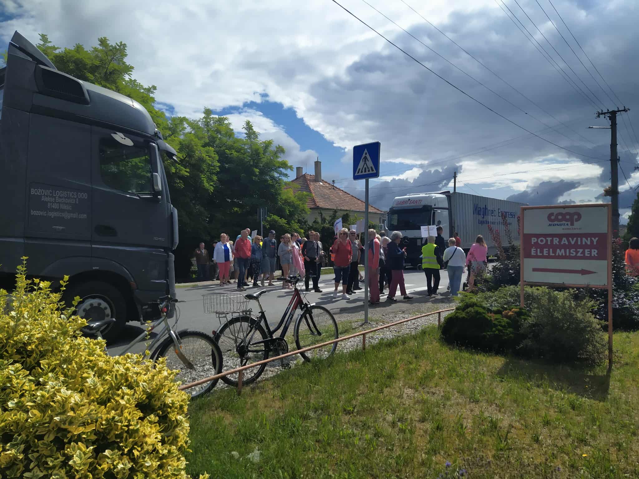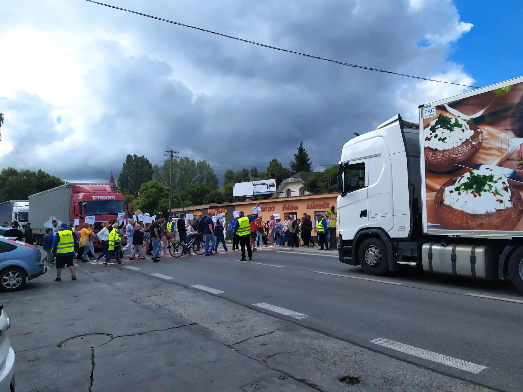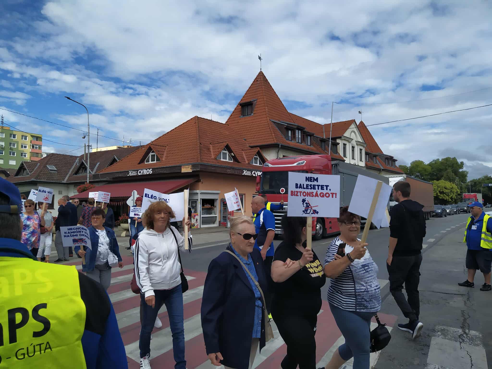 A város nem autópálya! Biztonságos közlekedést! Nem akarunk kamionokat az ablakaink alatt! Nem balesetet, biztonságot! – lehetett olvasni azokon a táblákon, amiket kezükben tartottak a zebrán oda-vissza sétáló gyalogosok. „Gútán, a főút mellett lakunk, akkora itt a forgalom, hogy alig tudunk kihajtani autóval. A csillárok beleremegnek, amikor a nagy kamionok elhaladnak az ablak előtt, és bizony a ház falain is keletkeztek repedések – sorolta egy középkorú nő. – A Monostori híd megnyitása óta érezhetően többszörösére nőtt a forgalom. Iskola is van a főút mellett, csoda, hogy itt a városban még nem történt tragikus baleset.” Keszegfalván egy férfi arról beszélt, hogy nagyon sok járművezető, autós és kamionos egyaránt, bizony a megengedettnél jóval gyorsabban hajt keresztül a falun. „Már az is sokat segítene, ha kitiltanák innen az átmenő kamionforgalmat, vagy súlykorlátozást vezetnének be” – tette hozzá. Az egyik, nyitrai jelzésű kamion sofőrje mintha csak erre reagált volna, kérdésünkre, miért ezt az utat használja, csak annyit mondott: nincs tiltó tábla, miért ne mehetnék erre?