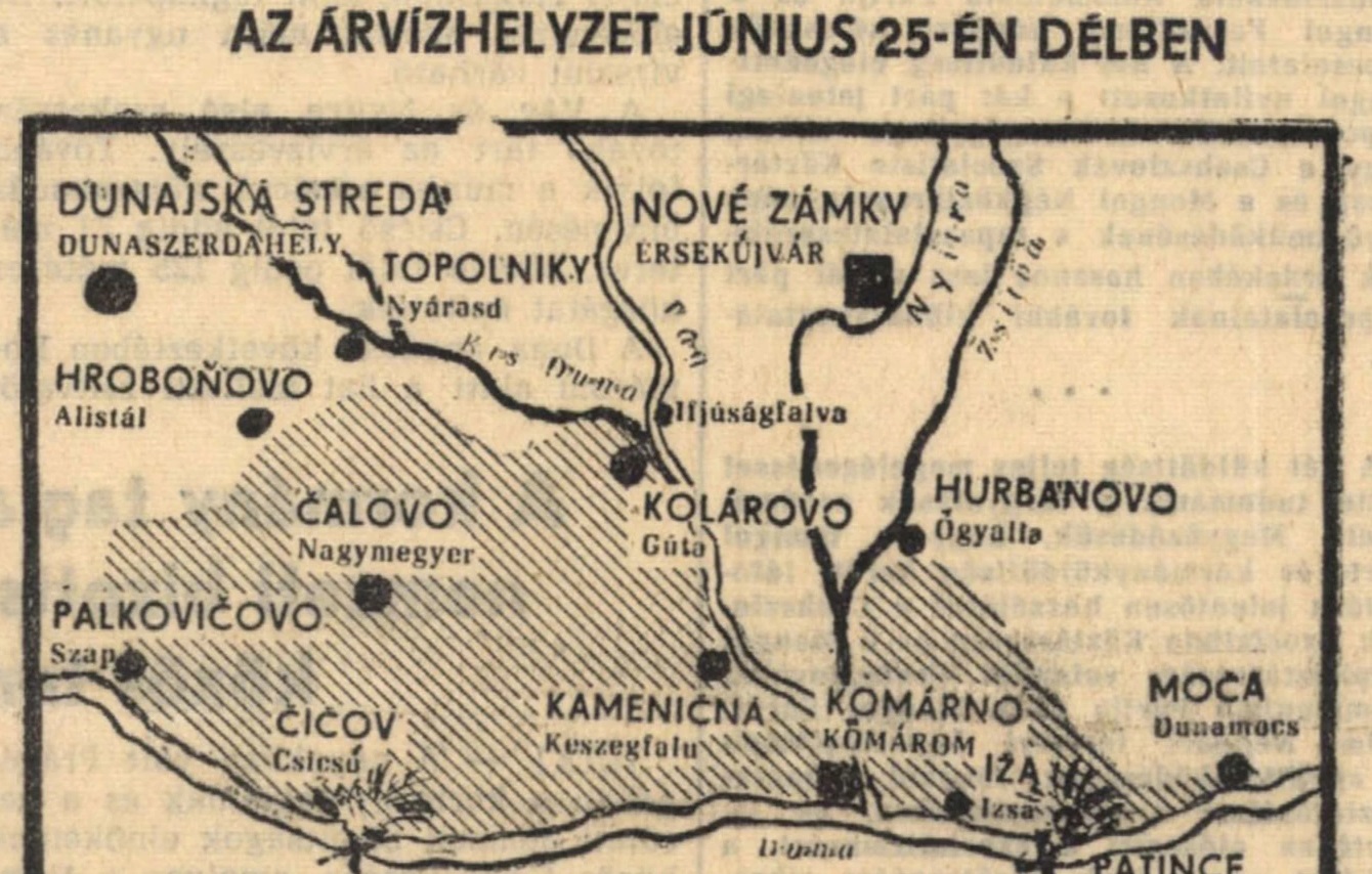 „1965 májusában nősültem, az árvíz pedig júniusban tört be, így mézeshetek helyett vizeshetek jöttek – emlékezik vissza Feri bácsi. – Feleségemet a többi asszonnyal együtt Komjátba és Nagykérre telepítették ki, családi házakban szállásolták el őket, a gyerekeket pedig a bajmóci pionírtáborba vitték.A szövetkezet állatállományát a Privigyei járásban helyezték biztonságba, a családok állatai meg a tyúkfarmon, ami nem került víz alá. Rengeteg munka szakadt rám, éjjel-nappali szolgálatot vezettünk be. A pozsonyi Stavoindustria cégtől kaptunk kölcsön három csónakot, mivel a falut nem lehetett száraz lábbal megközelíteni. Az emberek tutajokat készítettek, a legjobb Kósa Vince bácsié volt, még fekvőhelyet is eszkábált rá. A községi hivatal és a kultúrház berendezését a magasabban fekvő Fő utcába telepítettük, csak a páncélszekrényt nem tudtuk, az olyan nehéz volt – pedig nem volt benne sem nyugati valuta, sem csehszlovák korona, sem rubel. A katonák segítettek aztán száraz helyre vinni.A víz a Fő utca és a Kis utca kivételével az egész falut elöntötte. Filkó Gyula bácsiék a Kis utcában lacikonyhát nyitottak, szükség szerint vágták le a sertéseket, oda jártak kosztolni az itthon maradt férfiak. Aki éppen ráért, az halászni ment, ugyanis a visszahúzódó víz után a gödrökben maradtak a dunai halak, volt, aki zsákszámra hordta haza. Mivel a víz fertőzött volt, inni nem lehetett, a kocsmáros, Toščák Jani bácsi lóháton hordta Ekecsről a sört. Paksi Pista bácsi, akinek háza a temető mellett összedőlt, a két temető közti zöld területen vert sátrat. Nem kellett neki hűtő, a friss áru ’házhoz’ ment, ugyanis ide szorult a környező portákról a baromfi. Miután Pista bácsi családjával beköltözött a frissen felépített barakkba, árulkodó bizonyítéknak sok tojáshéj maradt utána.”